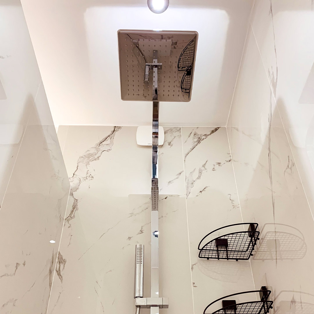 Les artisans Luxury Design ont travaillé sur une palette de finitions haut de gamme : enduits décoratifs minéraux, béton ciré satiné, effet terrazzo et touches nacrées. Ces matières, appliquées à la main, jouent sur la lumière et la profondeur des surfaces.